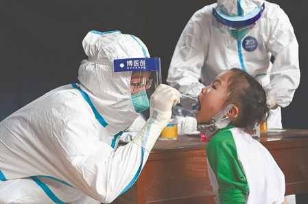 “不用怕,头往上仰,嘴巴张开……”22日上午,在福州仓山区金山社区监测点,身着白色防护服的福州市儿童医院医师、台胞林琨伟一边对女孩轻声嘱咐,一手拿棉签快速采样。