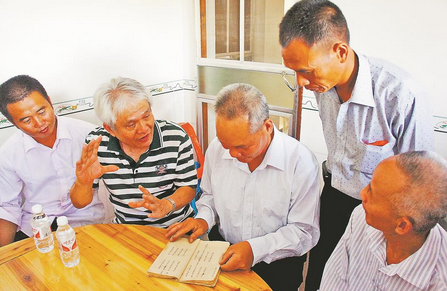 2012年,徐步在台孙子徐英一(左一)返乡时与南靖族亲一起翻阅手抄本。(受访者供图)