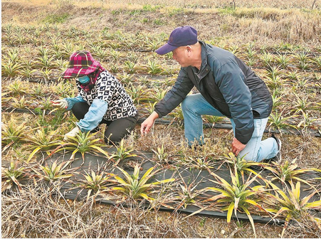 在凤梨田里,台农汪育森(右)指导农民除草。