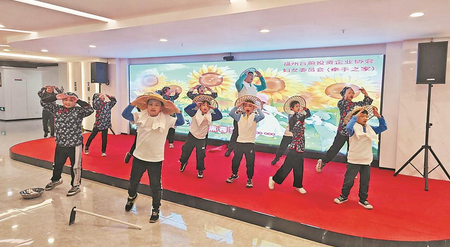 “《天黑黑》这首歌在唱到‘依哦哦’的时候,双手要记得放在额头上,做出张望的动作。”住在桂溪社区台胞公寓里的徐凤仪是榕台文化艺术团的艺术总监,当孩子们在台上载歌载舞时,她也在台下边唱边跳,一边做着示范,一边关注着孩子们的表情和动作,并适时地作出调整,让整体舞台效果更趋完美。