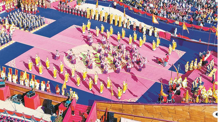 “世界同庆,岛夷共仰;礼庭皆予,四海来朝……”祭颂礼赞环节,娓娓讲述妈祖护国庇民的丰功伟绩。妈祖金身后,一面印有“世界和平女神”封号的巨型帆旗缓缓升起,祭典进入高潮,现场一片欢呼。活动尾声,主祭人携海内外妈祖文化机构代表等一同行放生礼,体现保护海洋的生态观。放生礼毕,28艘渔船齐声鸣笛,承载着人们的美好心愿驶向远方。海祭礼成后,随着七彩烟花绚丽腾空,妈祖金身继续巡安布福湄洲岛。