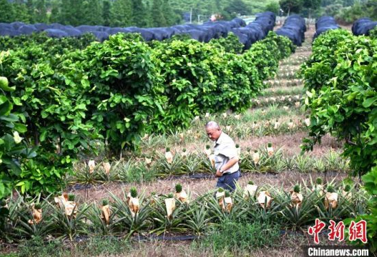 7月15日,漳州市漳浦县前亭镇的漳浦蜜原生态农场里,台胞詹畯泽正在查看凤梨的生长情况。 中新网记者 吕明 摄