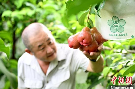 7月15日,詹畯泽在果园查看莲雾生长情况。 中新网记者 吕明 摄