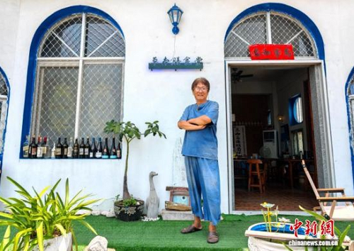 17日,在东山县康美镇美山村,台胞杨克政站在其设计并经营的民宿“杨家庄海岛酒店”前拍照留念。 中新社记者 吕明 摄