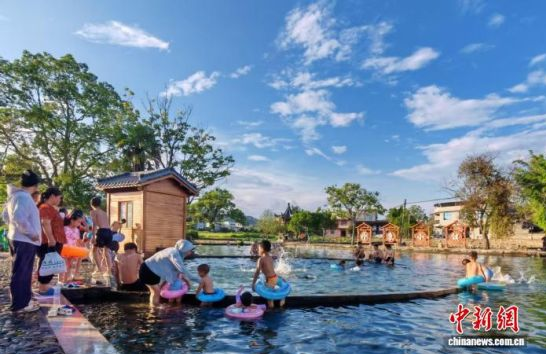 正值暑假,位于福建省清流县李家乡鲜水村的“冷泉小镇”景区游人如织。不少村民推着手推车在景区穿梭售卖特色零食,与水池中人们的嬉戏画面相映成趣,构成一幅动静相宜、生活气息浓郁的民俗画卷。