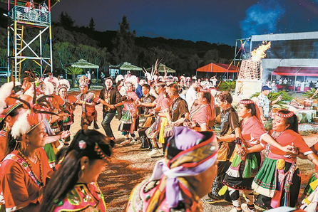上个月,岚台丰收交流活动现场,南岛舞集舞团成员与台湾阿美同胞载歌载舞、共庆丰收。通讯员 林君斌 摄