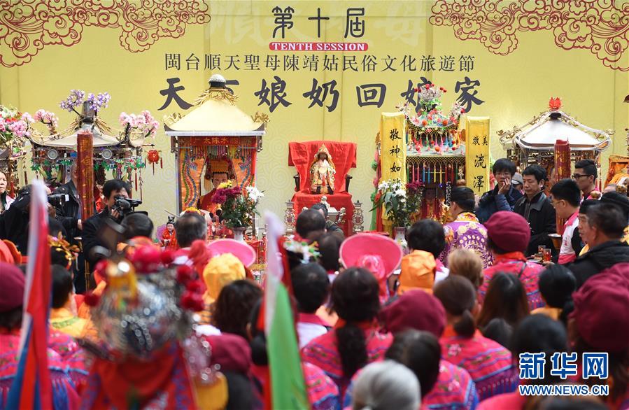 3月4日,第十届陈靖姑民俗文化旅游节“天下娘奶回娘家”活动在福州陈靖姑故居举行,来自闽台的陈靖姑信俗文化传承人带着各自宫庙供奉的陈靖姑金身回到故居“省亲”。临水夫人陈靖姑是闽台等地民间崇奉的妇女儿童保护神,在此次共祭活动中,两岸信众展现同根同源的民间习俗,共同传承历史悠久的中华民俗文化。(新华社记者 林善传 摄)