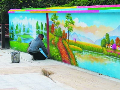 在台湾社区营造团队的指导下,园坂村村民在做墙体彩绘,美化乡村环境。