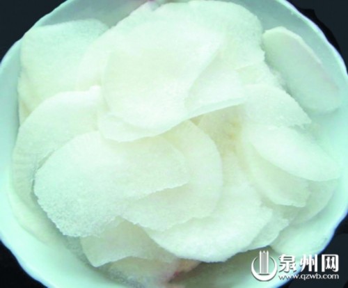 做法:将萝卜切片稍腌,去掉苦水,加入适量的盐和糖(有些人以糖精代替糖)。一般腌制100斤白萝卜需要5斤盐,个头小的白萝卜腌制四五天,个头稍大一点的腌制五六天。