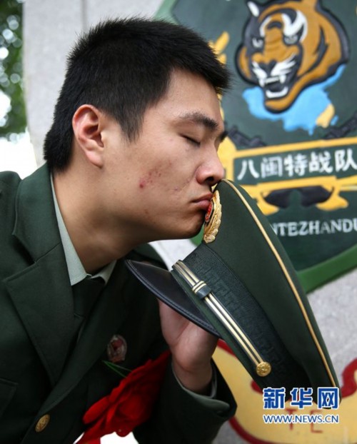 11月29日,武警福建总队直属支队退伍特战队员黄焕特在八闽特战队队碑前深情吻别朝夕相伴的警徽